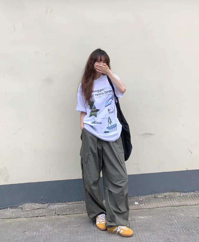 很喜歡這種慵懶隨性的穿搭,大大的白色t恤+工裝褲,上下都是寬鬆的版型,對身材有着極佳的包容性,藏肉更顯瘦。鬆弛感滿滿,如果你覺得這樣穿沒啥亮點,那麼可以試着選擇一雙亮色的鞋子來配,這樣就能輕鬆點亮整個造型了。