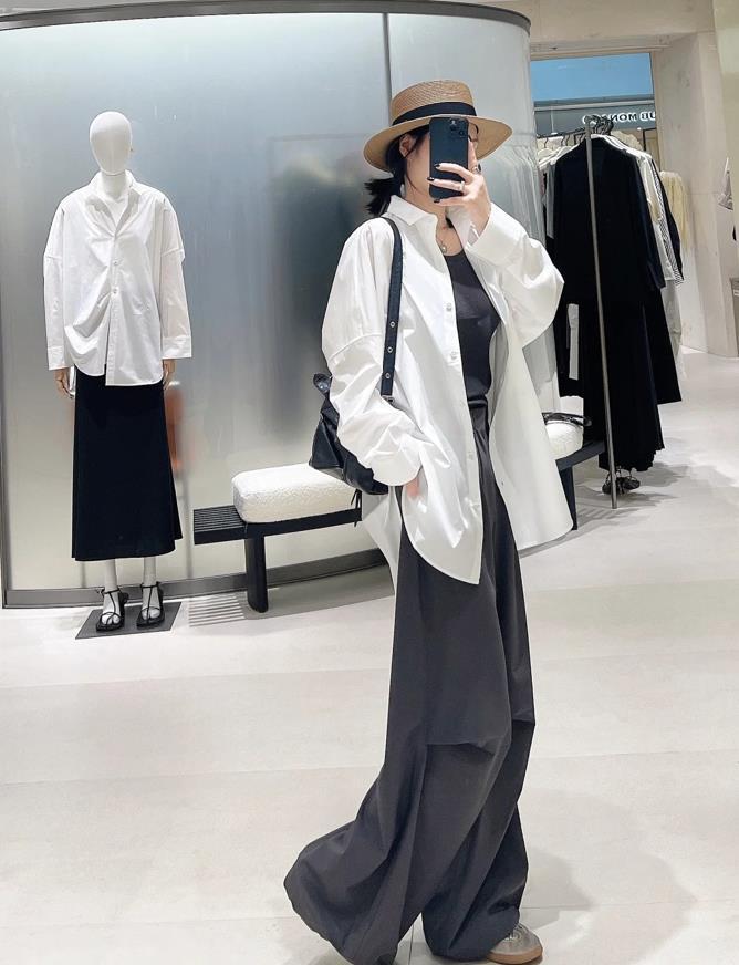 白色襯衫+灰色工裝褲,鬆弛感十足的搭配,看起來也太不錯了,都是基礎款,組合在一起那簡直太隨性時髦了。寬鬆的白襯衫+工裝褲,整體組合在一起可太舒適了,隨性範十足。