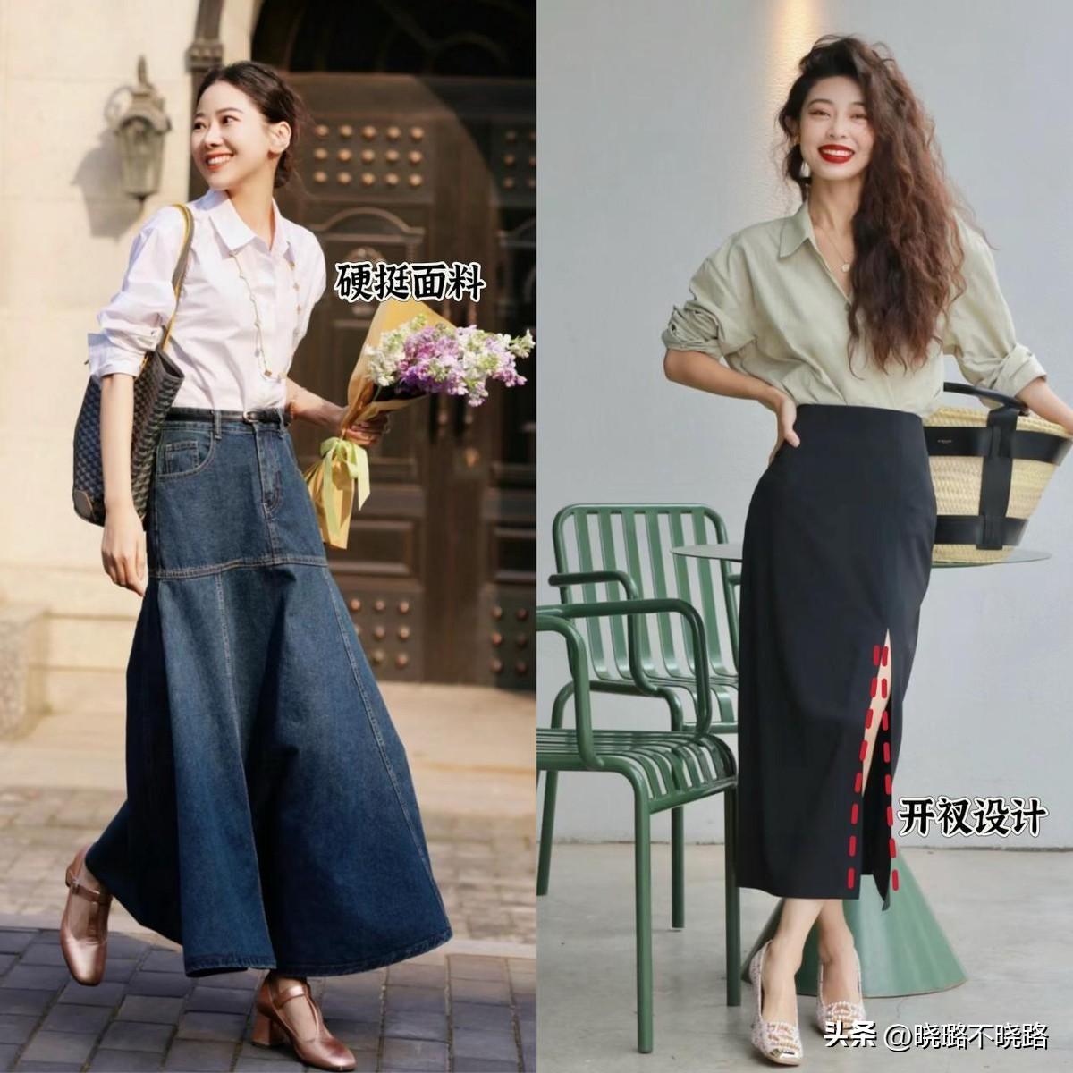 大骨架最忌諱的就是穿衣浮誇,無論是上衣還是下裝,都要避開太繁瑣複雜的設計,越簡約的款式,穿在身上越顯瘦。搭配廓形襯衫時,選擇一件高腰款式的牛仔A字裙,或者西裝面料的高開叉包臀裙,顯瘦還時髦。