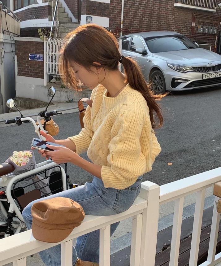 都說韓國姐妹們很會穿,的確是這樣,在她們的搭配裏,穿搭都是十分有氛圍感的,奶黃色麻花毛衣,質感很厚實,但也不會感覺到扎身,寬度適中的版型,可太藏肉顯瘦了,搭配起一條牛仔褲,青春減齡又不失時髦。