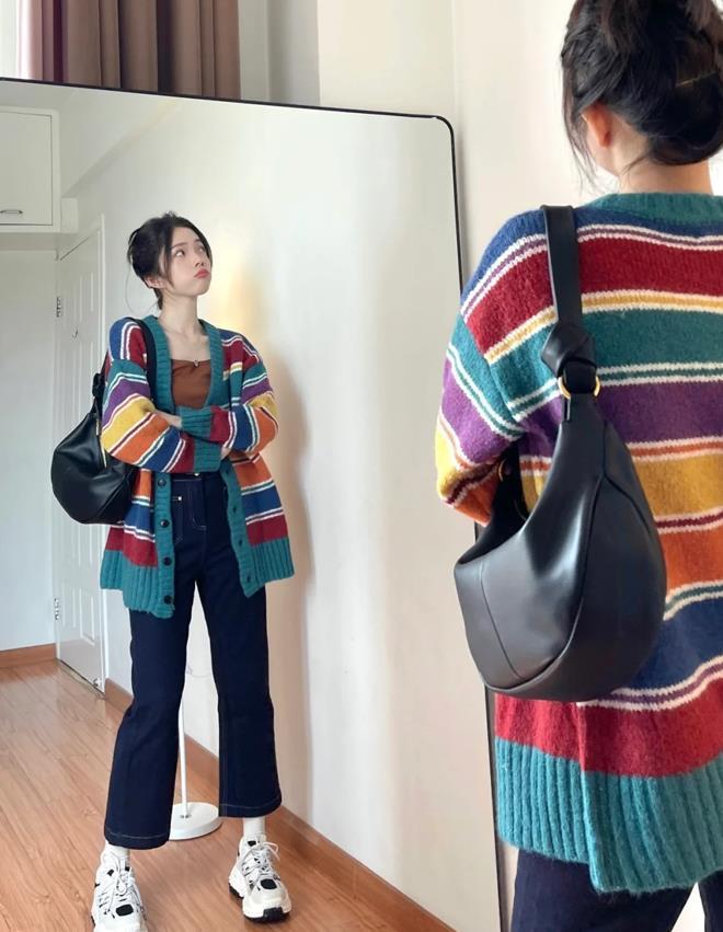 彩虹色的撞色毛衣,第一眼看到了就很心動,彩虹條紋真的非常吸睛,毛衣的面料也軟軟糯糯的,選擇微喇牛仔褲來配,很不失氣質,鞋子配運動鞋就好,一整個休閒感十足。