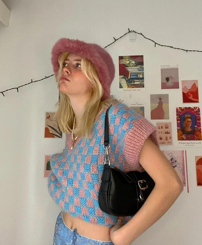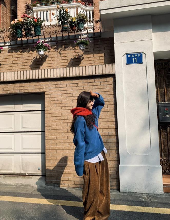藍色+棕色的搭配,自帶復古氣息,還利用了紅色來點綴,真的是一秒就打造出你想要的氛圍感,藍色毛衣+襯衫的疊穿,增加層次感又時髦,上下版型都是寬鬆的,有種鬆弛感,隨性極了。