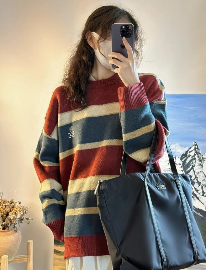 這個條紋撞色毛衣,我看起來也太喜歡了,毛衣的手感軟軟糯糯的,穿起來可舒服了,寬大的版型,很藏肉顯瘦。自帶慵懶的氣息,下身配一條淺色的休閒褲,或者是牛仔褲,就能穿得很休閒好看。