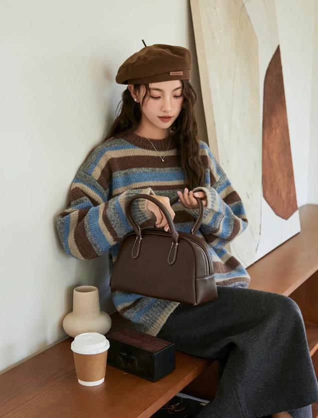 韓系復古風的穿搭,看起來也太不錯了,多種顏色碰撞的條紋毛衣,穿起來就十分有慵懶的氛圍感,與深灰色半身搭配一起,一整套看起來滿滿的簡約氣質,再佩戴起一頂貝雷帽,整體是小面積的棕色呼應,復古氛圍感直接拉滿了。