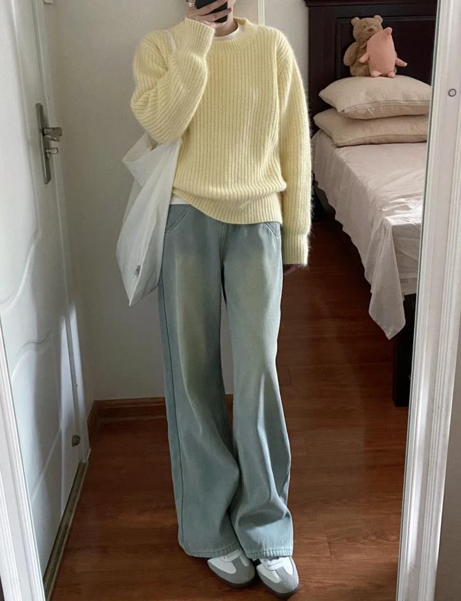 奶黃色的毛衣,真的讓人無法拒絕呢,這種低飽和度配色,任誰看了都很喜歡吧?簡約乾淨又自然,秋天的時候,可以在裏面疊穿一件白色t恤,增加層次感又時髦。選擇一條水洗牛仔褲,加上一雙德訓鞋,太舒服了。