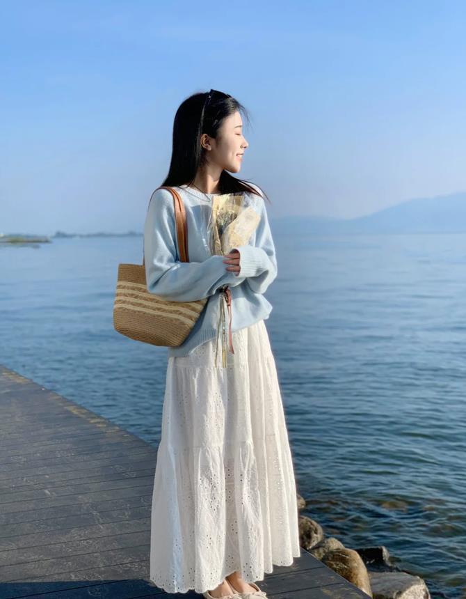 淺藍色的毛衣看起來也太溫柔了吧,這種低飽和度的配色,就是不挑膚色,搭配起一條白色半身長裙,藍白的搭配,也太清爽吸睛了吧,很洋氣又減齡。