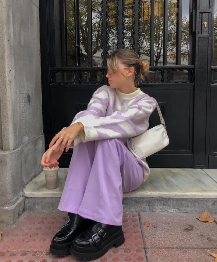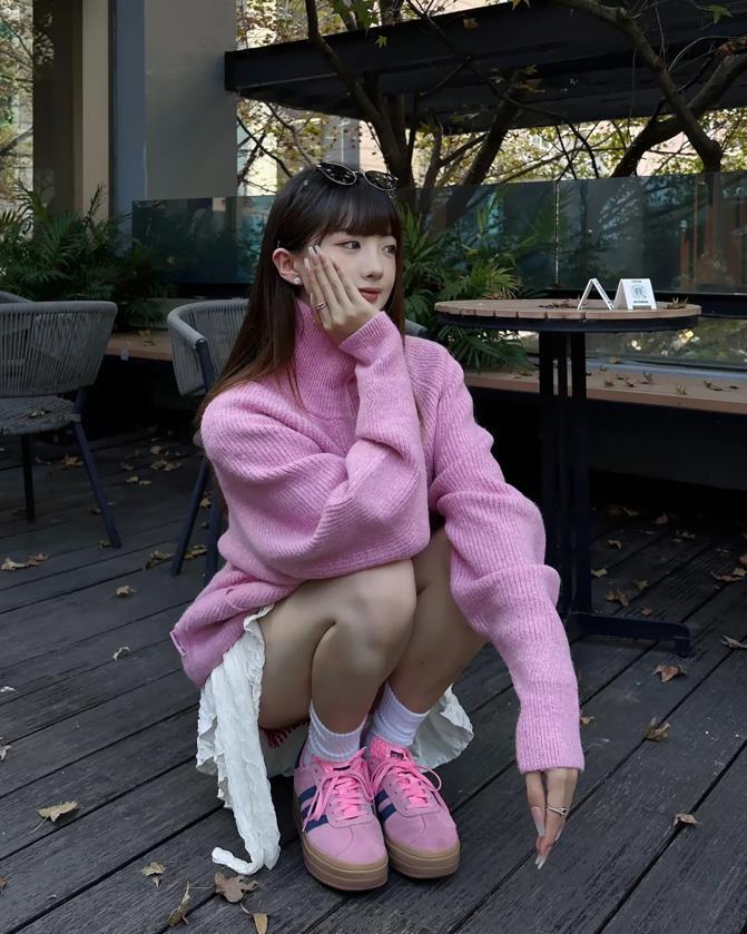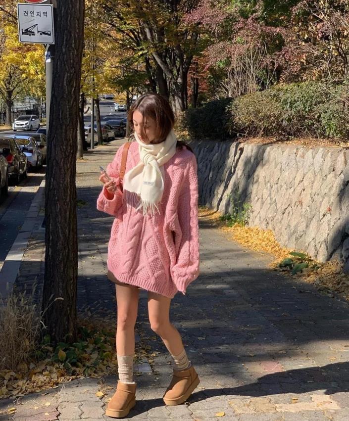 今年粉色系的毛衣,也非常流行呢,這一套穿搭看起來奶裏奶氣的,還充滿了少女氣息,寬大版型的粉色毛衣,喜歡慵懶隨性範的姐妹,就可以爲自己入手一件這樣的毛衣,下身可以搭配光腿神器,或是短裙,輕鬆打造出大長腿。