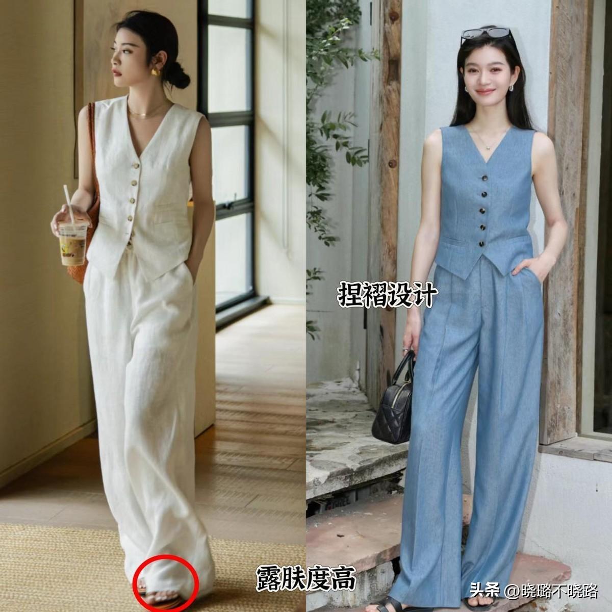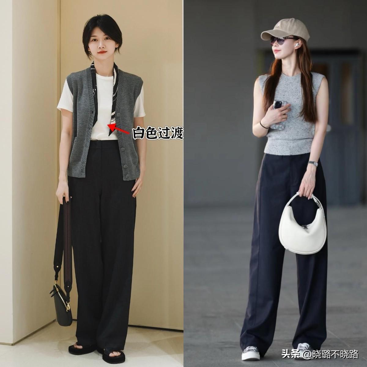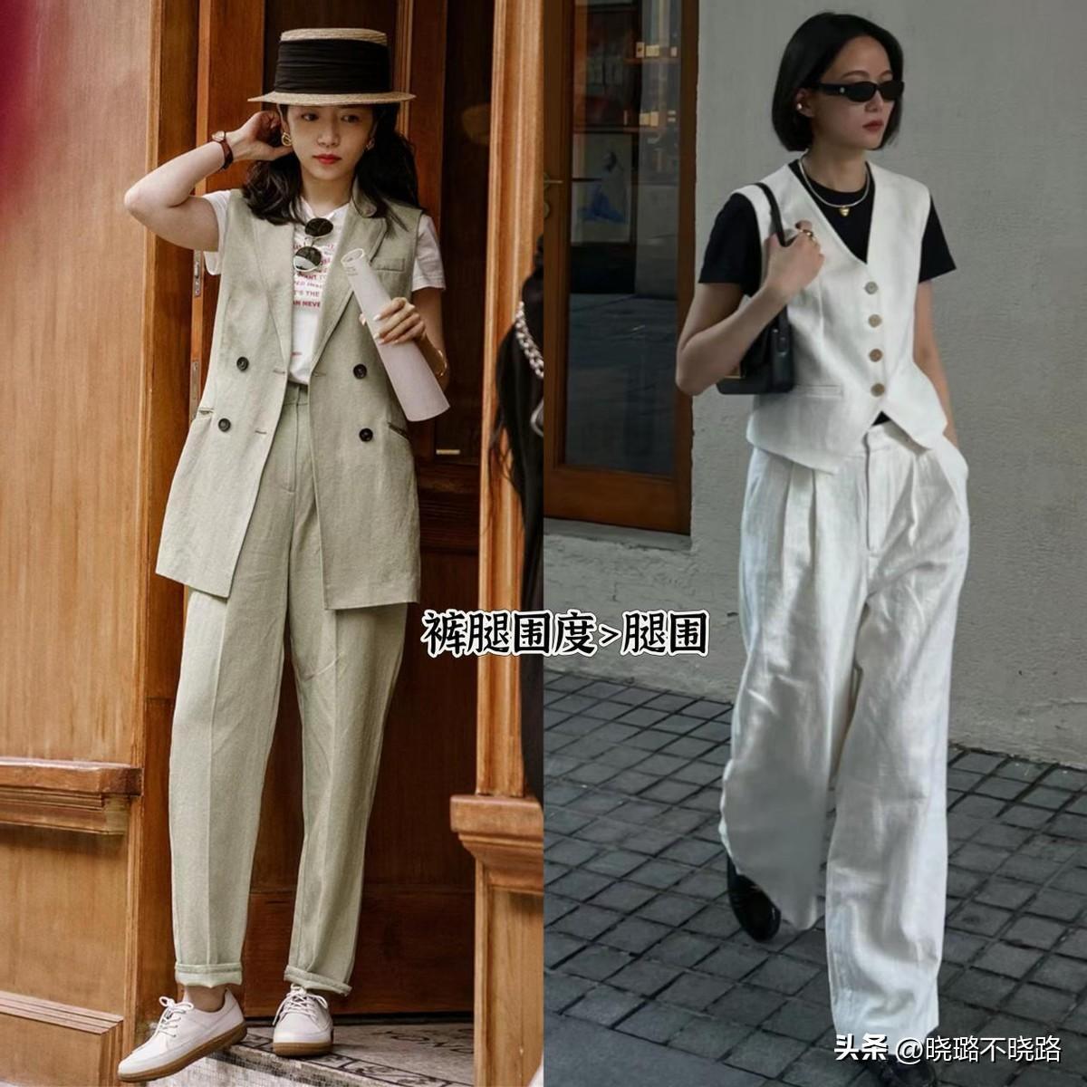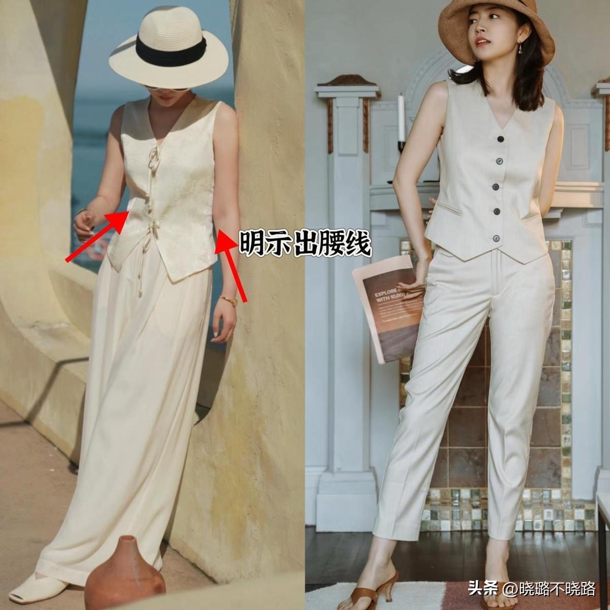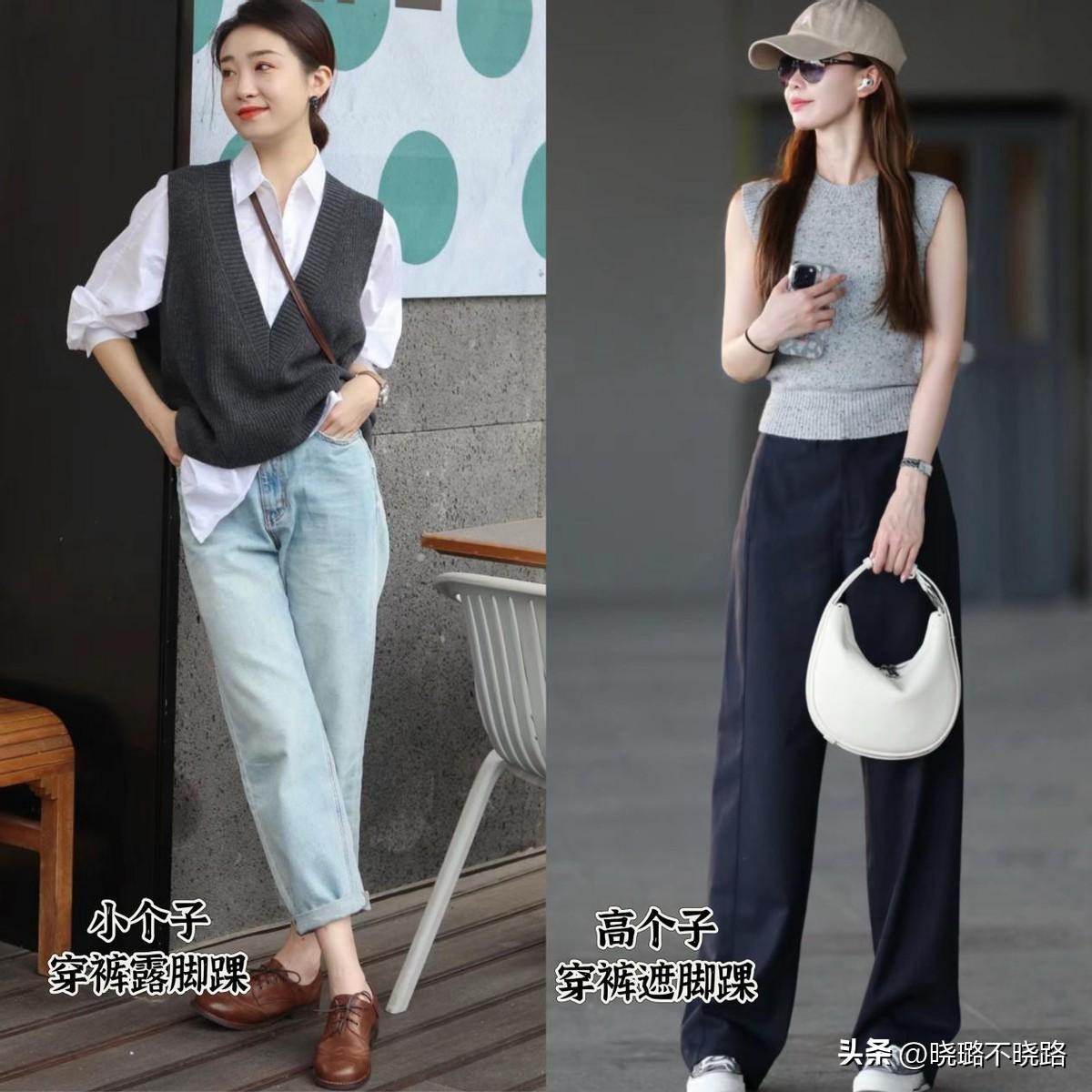 穿馬甲和長褲,要學會明示出腰部線條,上衣的腰線要收緊,褲裝優選高腰款式,就算是搭配平底鞋,也完全沒有壓身高的問題。