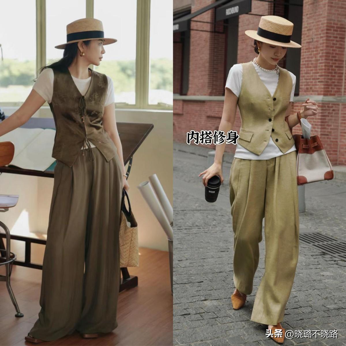 具體的搭配方案,可以通過配色、飾品、鞋子演變出更多的組合。西裝馬甲和闊腿褲大多數是套裝的類型,採用統一的色調、材質和裁剪方式,所以看上去也非常協調。