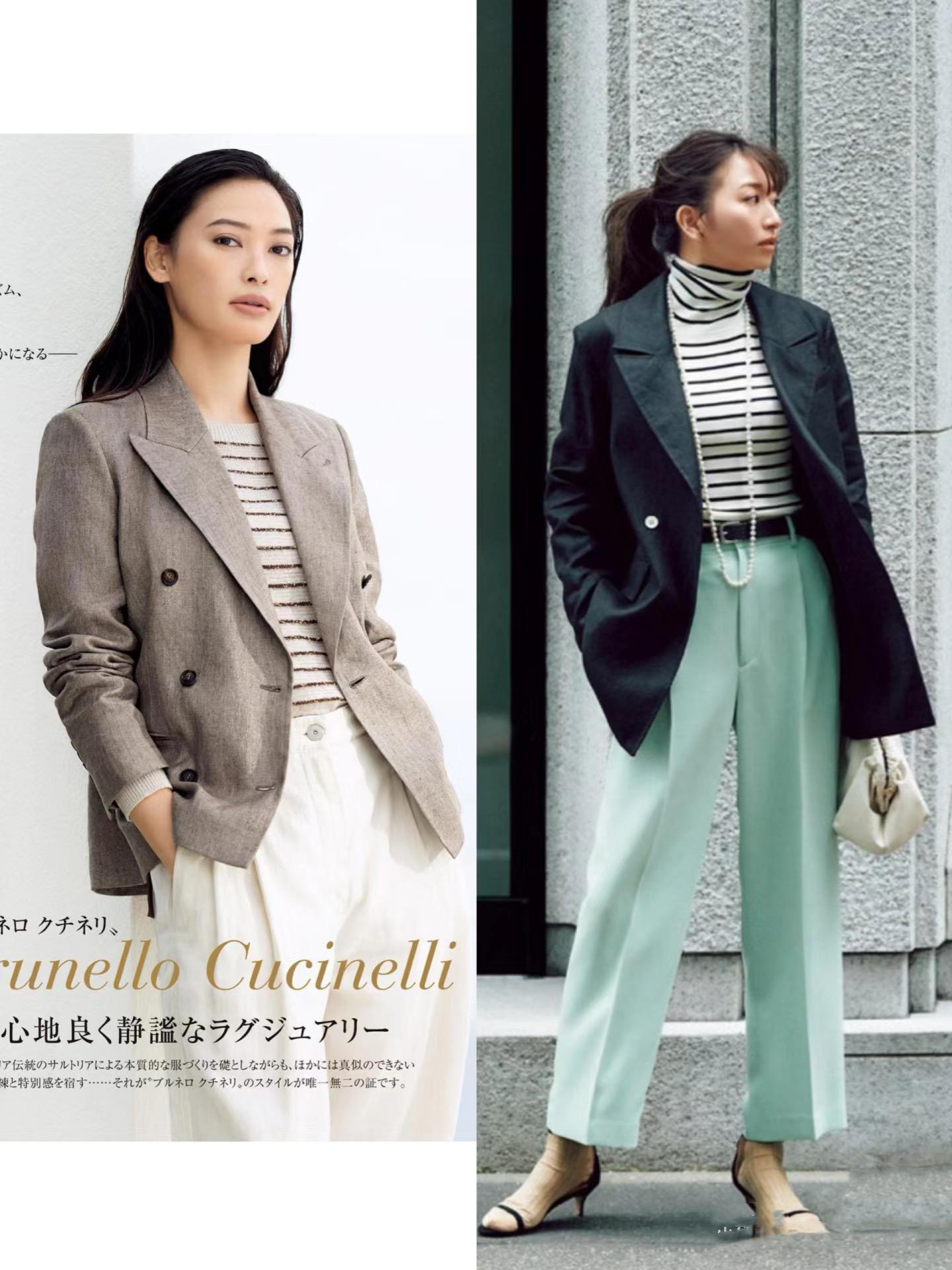 毛呢面料的西服更軟糯、厚實,防風性也更強。毛呢外套配條紋打底衫,搭一條高腰的錐形褲,簡簡單單就很好看。