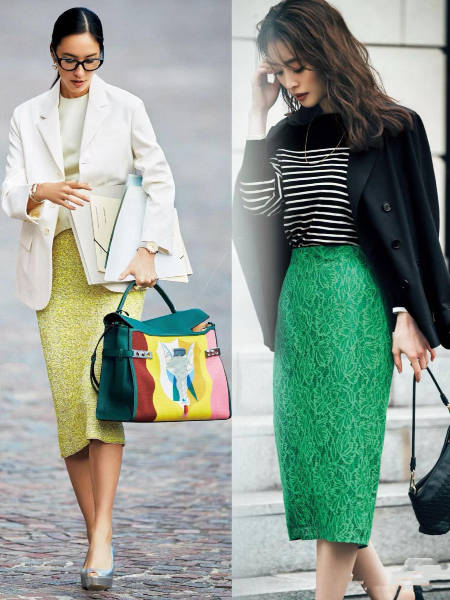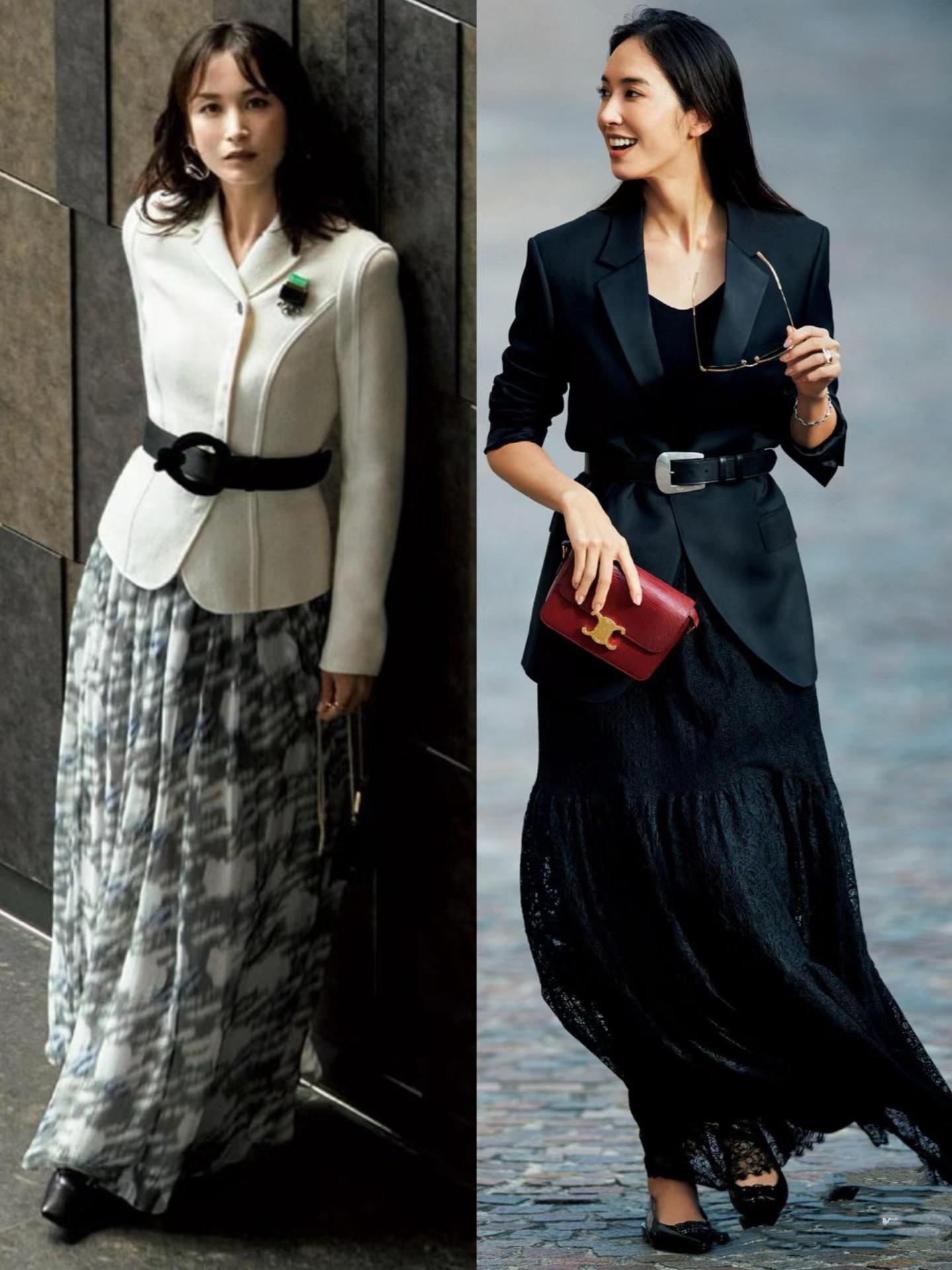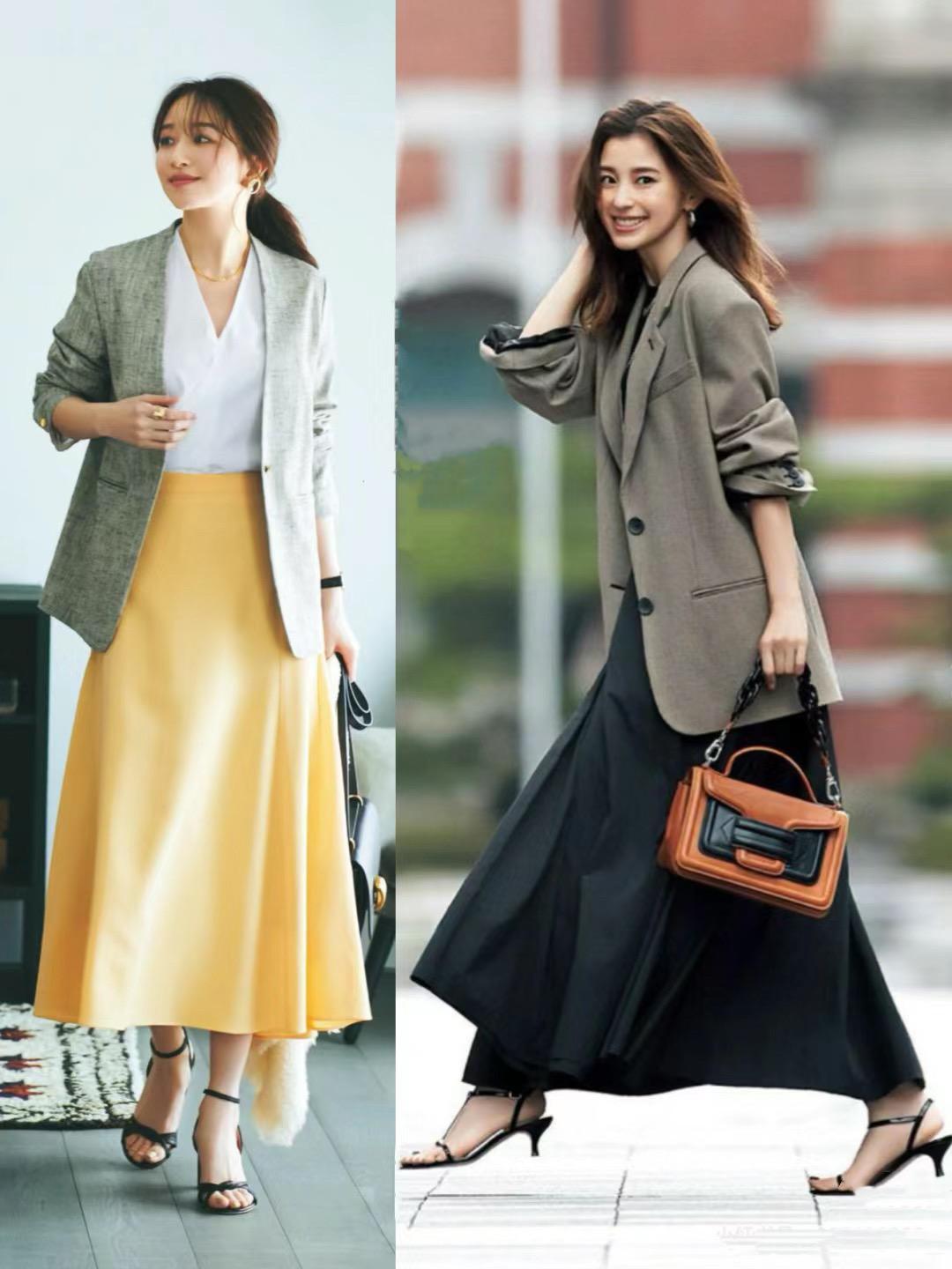 短款的西服外套,或者比較合身精緻的款式,最好是與長款及踝的裙子搭配,