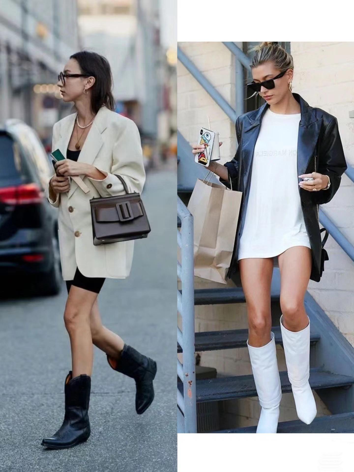 寬鬆的西服外套,皮革的面料更有辨識度,配白色及膝長靴,經典的黑白對比,洋氣惹眼、還非常的酷颯醒目。