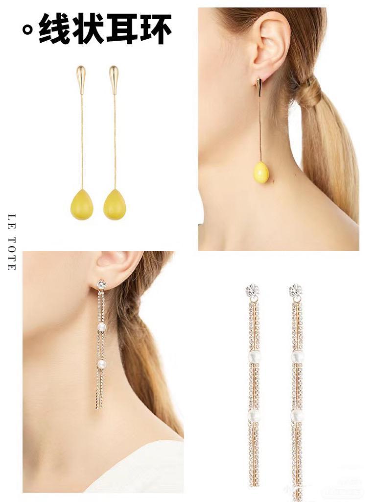 線狀的耳環,有一種自然垂墜的美,這種耳環能讓視覺線條自然拉長,顯得脖頸更爲修長一些。