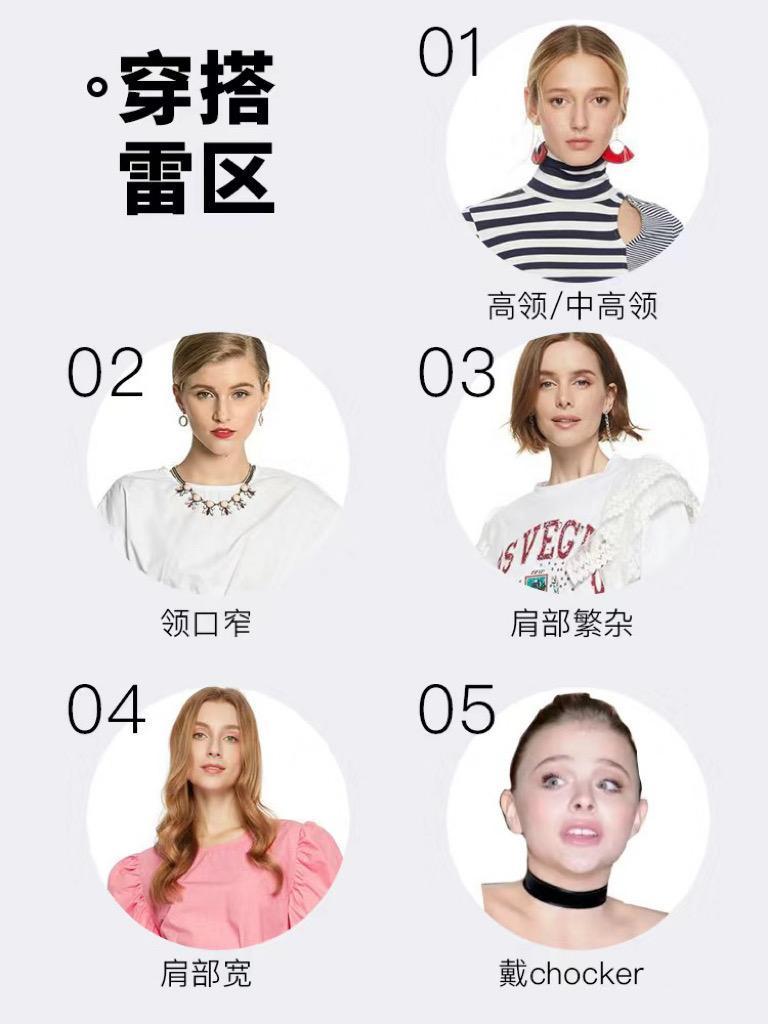 高領、堆堆領,包裹性太強,容易顯得壓抑。領口窄的衣服,也不利於頭身比的呈現。另外肩部設計複雜、肩部比較寬的領口,以及戴chocker的衣服,都不太適合脖子短的女生,暴露自己的短板,並不美觀。