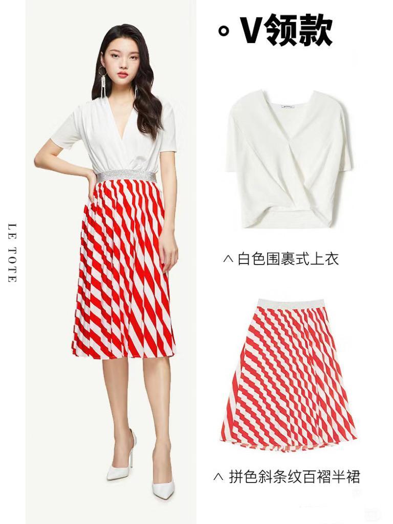 白色的V領襯衣,可以配撞色的斜條紋百褶裙。白色+紅色醒目又洋氣的配色,也讓我們的穿搭更加時髦惹眼。