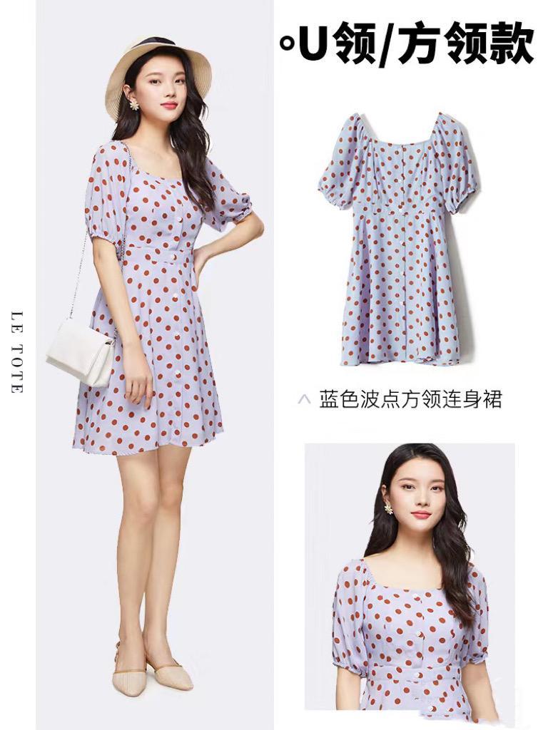 其實方圓領、大U領、大圓領,在視覺上的效果比較相似。像這種方形領口的波點連衣裙,穿衣起來輕盈又顯瘦。