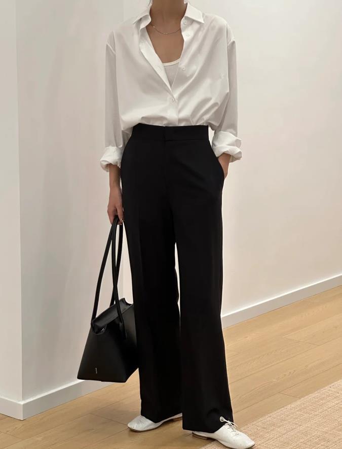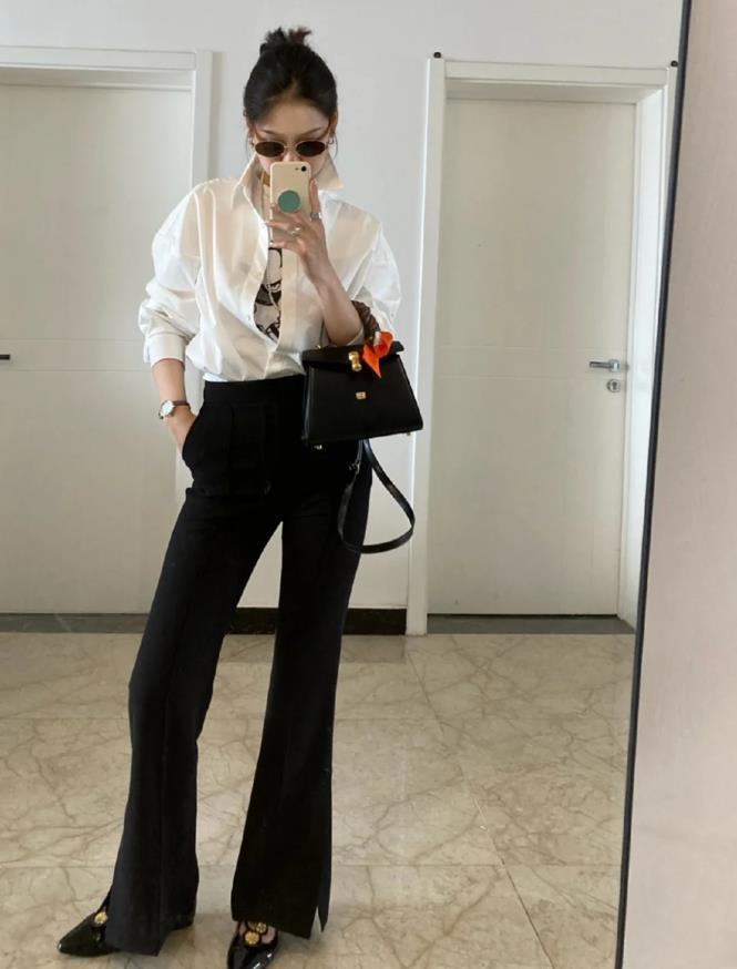 適合打工人的一套穿搭,白襯衫+小黑褲,真的好時髦耐看啊,這種微喇版型的黑色長褲,能很好修飾腿部線條,也藏肉顯瘦。高腰的設計,還可以把雙腿比例拉得很長,上衣是一件基礎款白襯衫,可以單穿,也可以在裏面疊穿一件小背心,就那樣把襯衫敞開來穿,也太性感了。