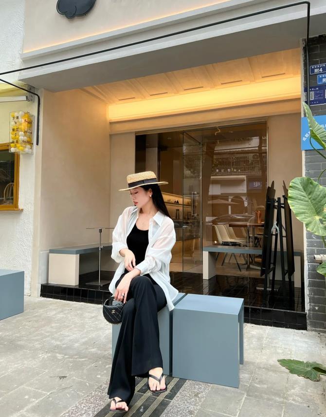 黑白配的組合,就是怎麼樣都看不膩,也不容易出錯,夏天少不了這樣已經微透防曬襯衫,裏面記得要多加上一件黑色小背心,這樣纔看起來更時髦好看,搭配黑色微喇長褲,簡潔鬆弛感十足。