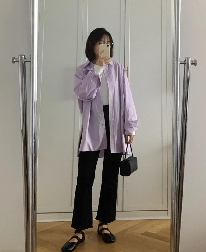 低飽和度紫色襯衫+黑色微喇褲,這樣一套穿搭看起來就非常不錯呢,寬大版型的襯衫,最喜歡了,不僅能讓你穿得舒適自在,還很藏肉顯瘦。褲子穿起來有些復古的調調,顯腿直,又能把雙腿拉得很修長。