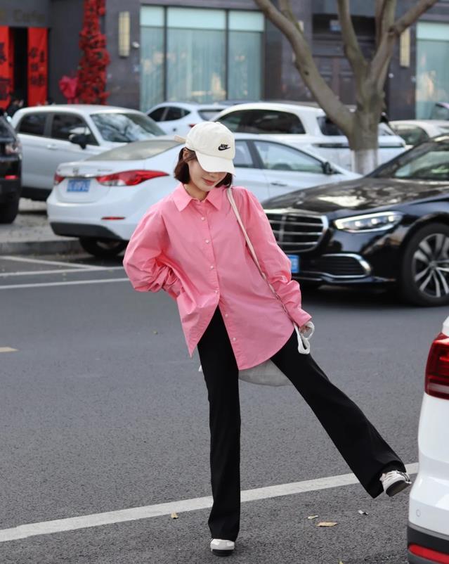 粉色襯衫這個顏色真的太減齡了,低飽和度的配色,就算是黃黑皮也是可以駕馭的,襯衫的版型是比較寬鬆的,大大的,很藏肉顯瘦。入秋的時候,記得內搭一件t恤,這樣就很好看了,下身配的黑灰色微喇褲,梨形身材的姐妹大膽嘗試下吧。