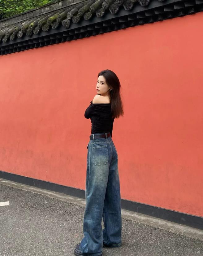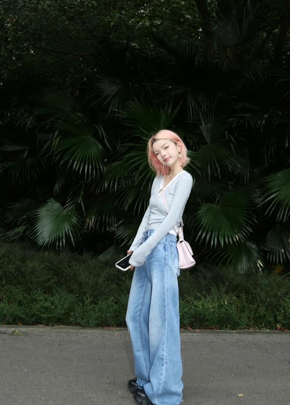 拖地牛仔褲+厚底鞋,這樣的組合,真的是巨顯腿長,個矮的姐妹們,說什麼也要試試看,褲子的垂墜感極佳的,加上寬鬆的褲型,可以讓穿上的人既不失腿長又顯高挑。上衣一件休閒打底衫,一緊一鬆的組合,很好修飾了整個身材比例。