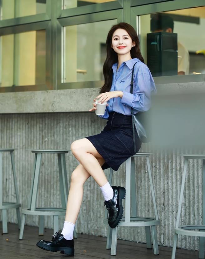 上班通勤的姐妹,不妨借鑑下這一套,經典藍色襯衫+牛仔半身短裙,因爲有了牛仔裙的加持,所以才減少了藍襯衫帶來的嚴謹和正式,再加上一雙黑色厚底樂福鞋,氣質舒適又顯高挑。
