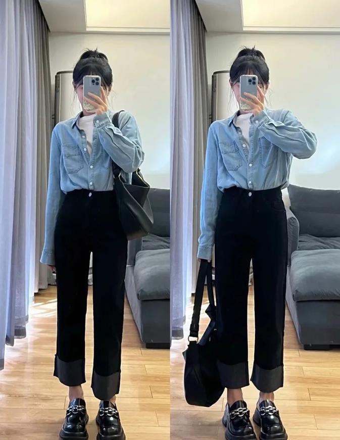 牛仔襯衫+白色t恤,疊穿最顯層次感了,也很不失時髦,記得牛仔襯衫的紐扣不要全部系起來了,露出裏面的內搭,才更顯層次。搭配九分直筒牛仔褲+厚底樂福鞋,既不失通勤又百搭。
