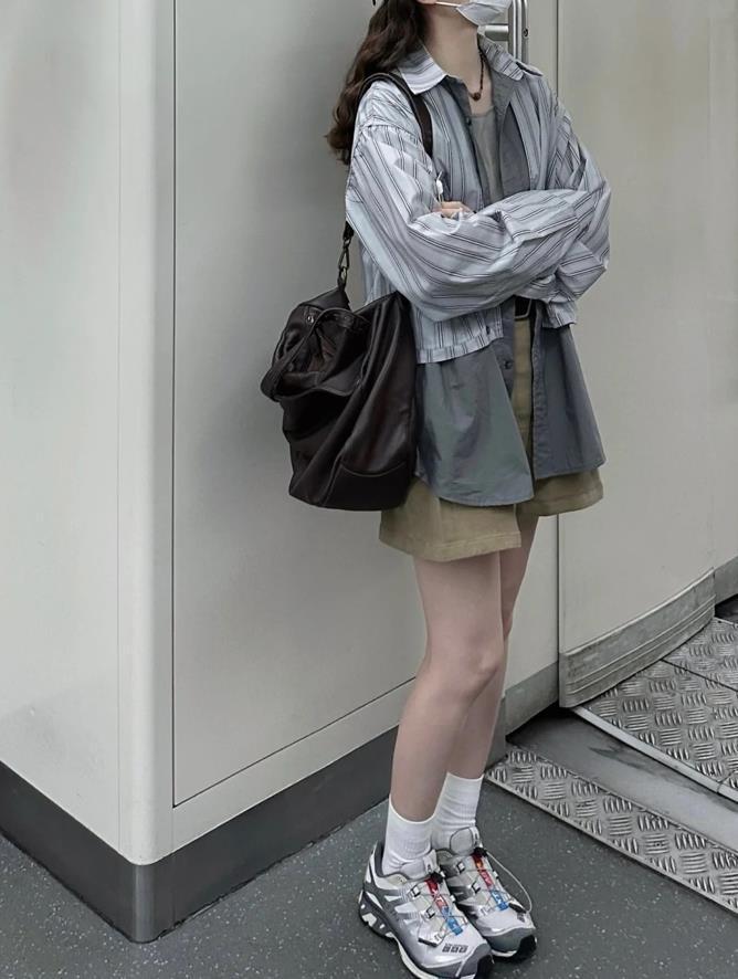 襯衫與背心的搭配,真的是太時髦好看了,而且這樣的疊穿也是很常見的組合,拼色條紋款式的襯衫,真的非常個性。下身配一條休閒短褲,簡單耐看。鞋子搭配了一雙厚底運動鞋,真的把腿部線條拉得很修長。