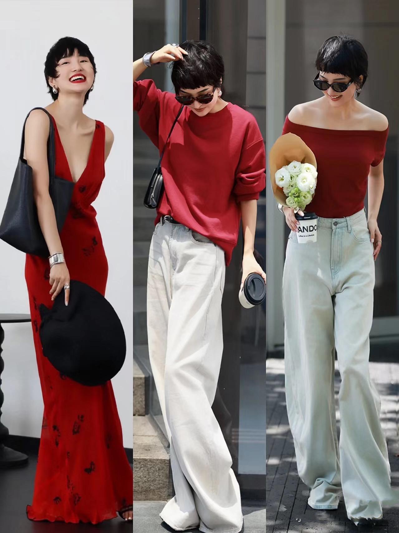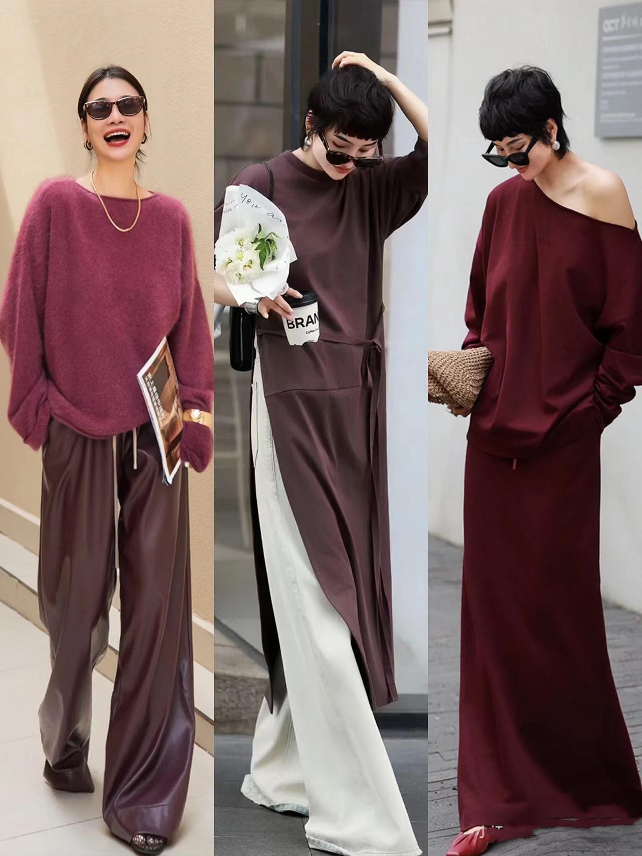 比如梅子紅色連衣裙,或者梅子紅的T恤、一字肩上衣,在秋天裏都可以安排起來。梅子紅的T恤/衛衣,配白色闊腿褲乾淨又醒目。