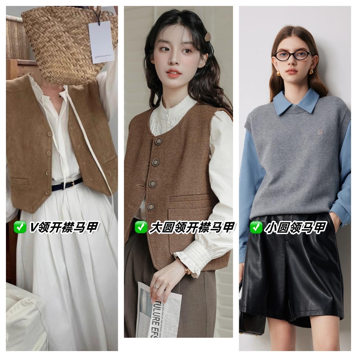 還有這種中長款的毛衣馬甲,圓領的款式顯得脖子特別短,長款的設計也非常壓低身高,如果非要選毛線材質,建議選擇短款、V領、可開衫的馬甲款式。