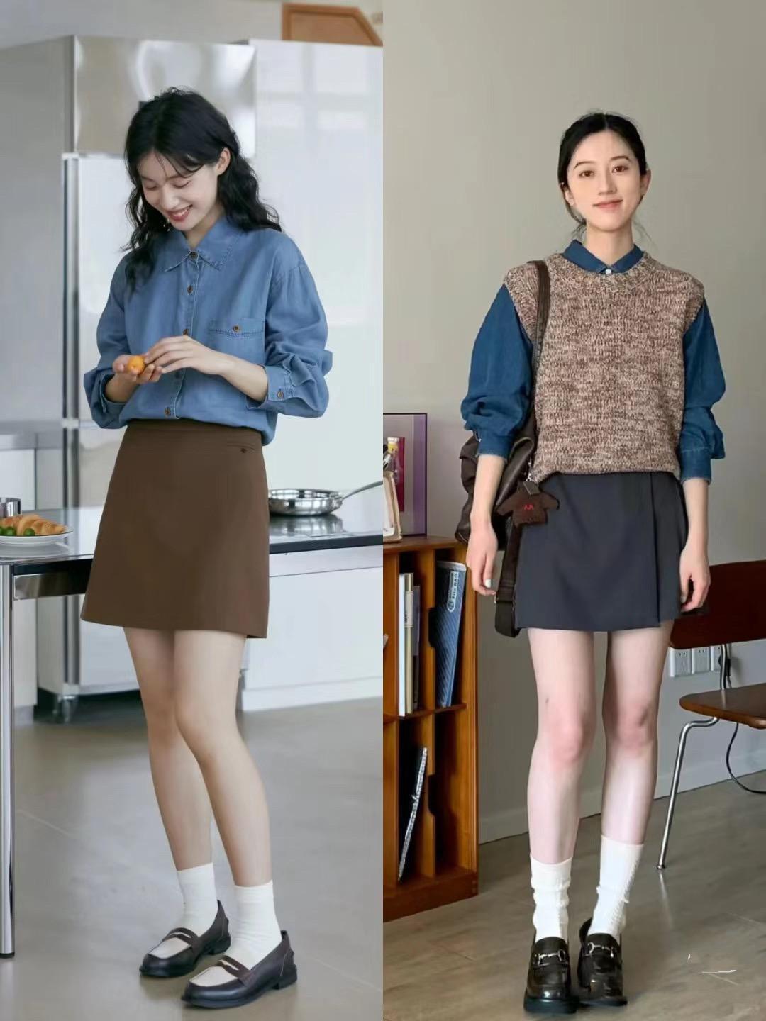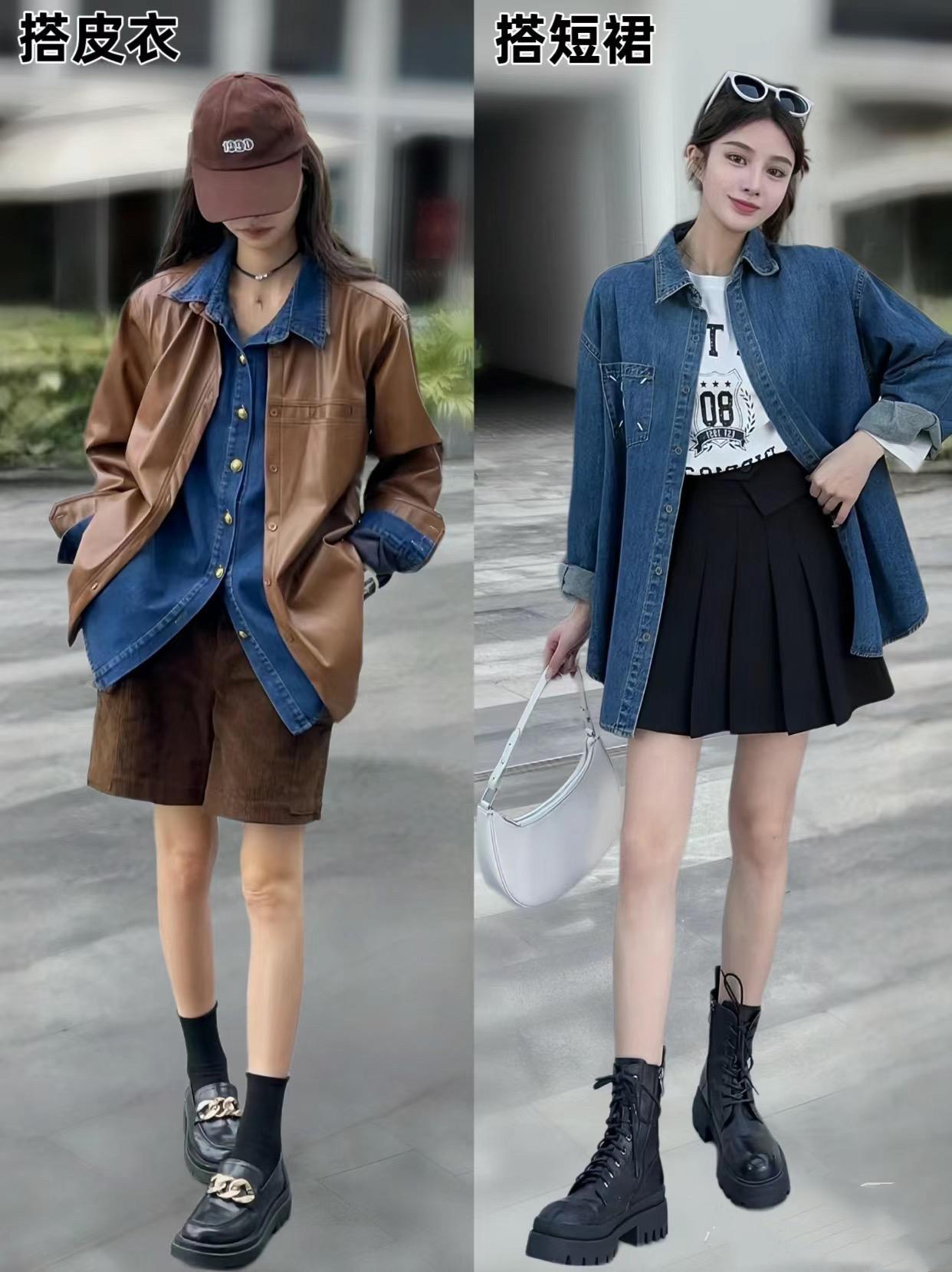 像這種牛仔襯衫,不管是搭皮衣還是配打底衫,都可以配短褲/短裙。牛仔襯衫配黑色百褶裙,帶着一抹溫柔,酷颯甜美。