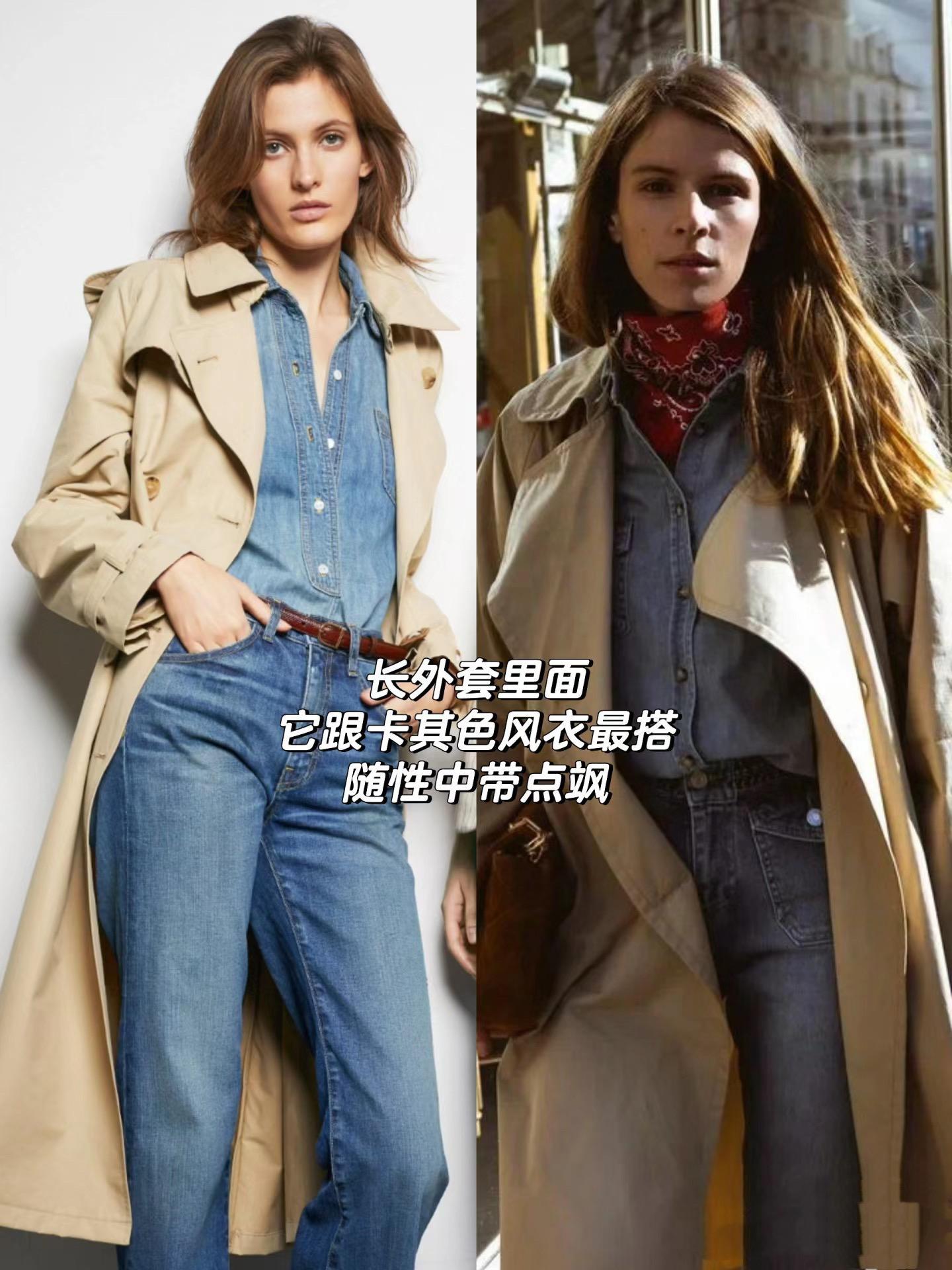 牛仔襯衫配卡其色風衣,隨性中帶一點颯