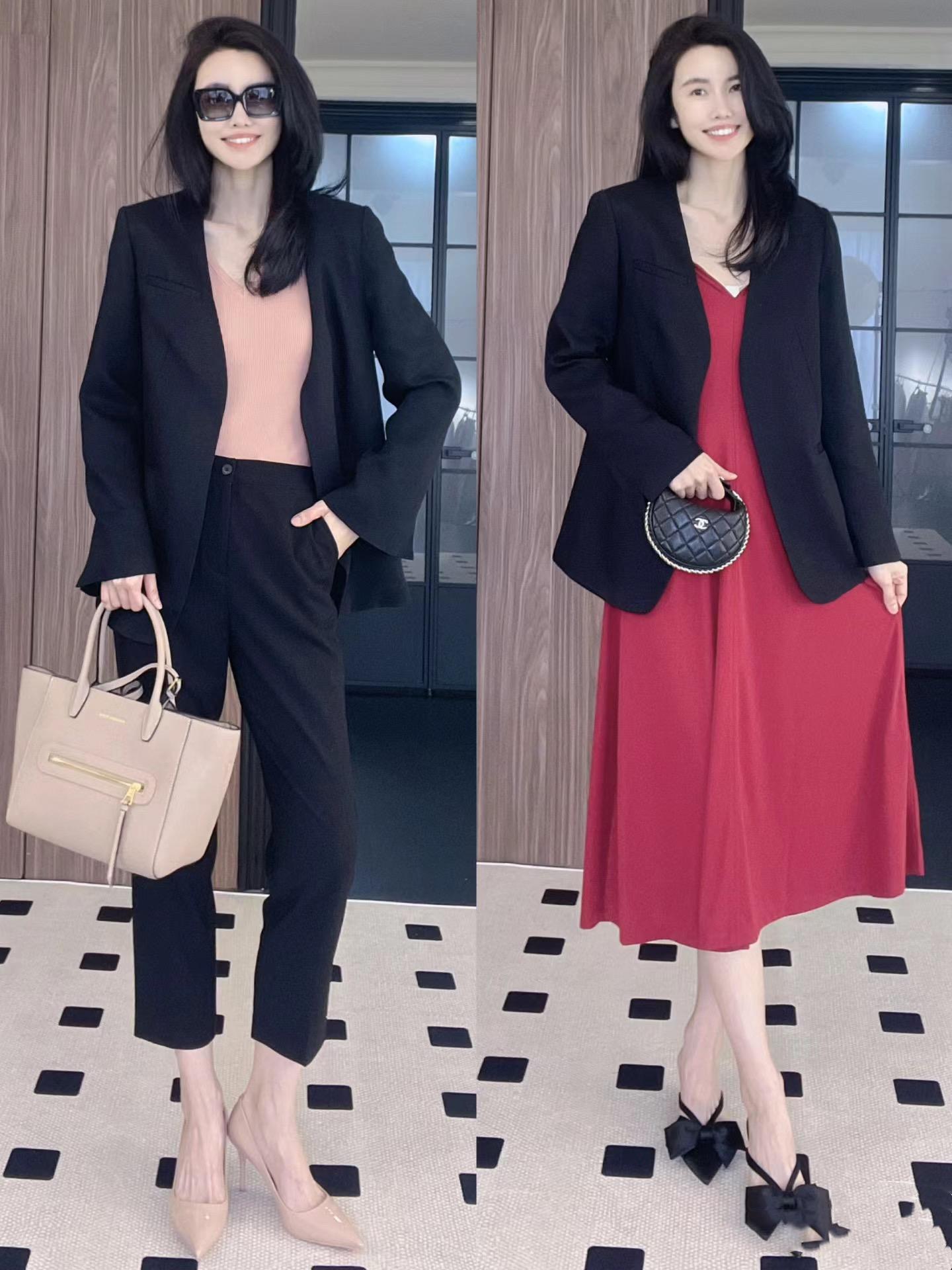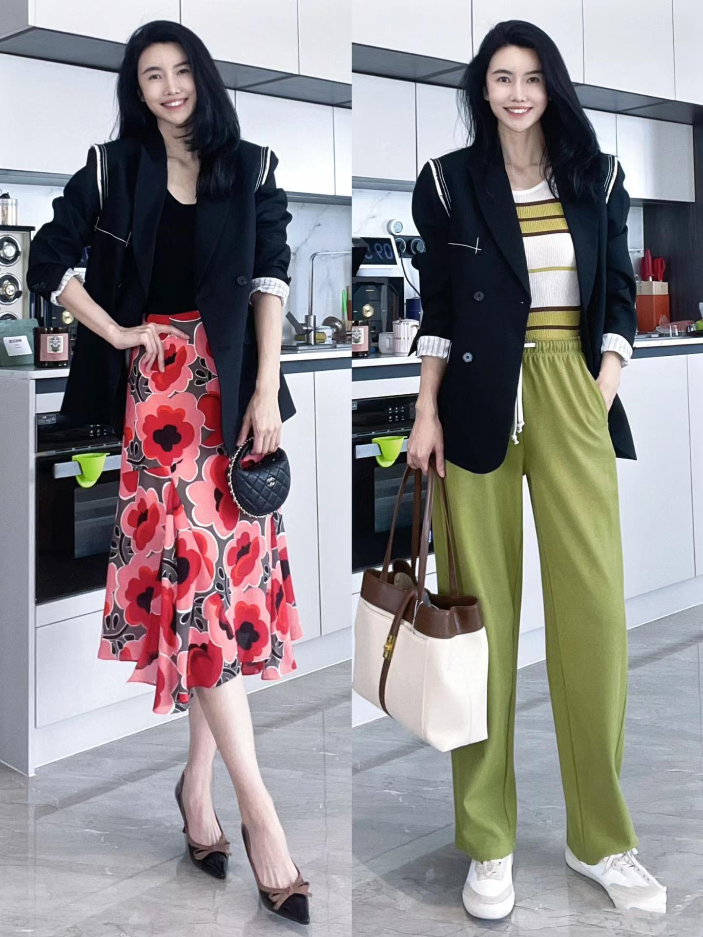 黑色打底衫+紅黑印花的半身裙,真的是高級又豔麗,這樣的穿搭也是超有女神範。黑色西服+黑色打底衫,儘量配比較修身的打底衫,視覺上會更顯瘦一些。