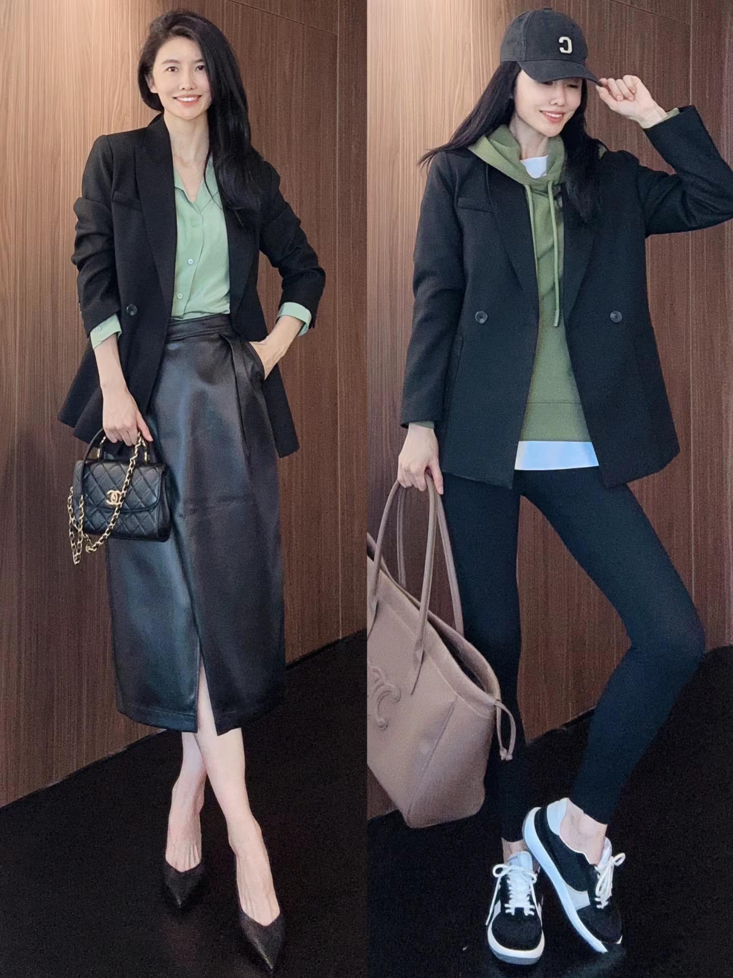 一種很溫柔,也很顯氣質的穿搭look。像這種黑色西服,配上柔和的豆綠色,乾淨又顯白,氣質裏帶了幾分清冷。