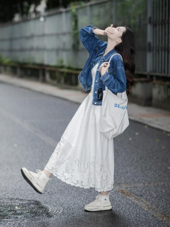 短款的牛仔外套,彷彿就是爲了小個子女生量身定做的,選擇與白色半身長裙相配,上短下長的組合,能很好拉長腿部線條,腳下踩着一雙白色帆布鞋,簡簡單單的就很好看,最重要的是舒適。
