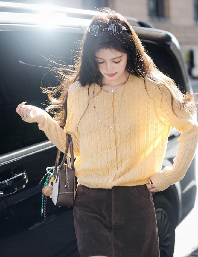 被這一件芝士黃針織開衫吸引住了,軟軟糯糯的材質,穿上身後可非常顯白呢,也很提氣色,版型是帶點鬆弛感的,所以穿起來並沒有太緊身,秋冬季節,就是要多點明亮的色調,不能選擇過於沉悶的顏色來穿,下身配一條深咖色半身短裙,有些顯復古的氣息。