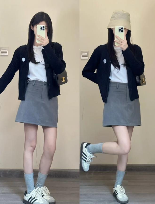 158小個子女生該怎麼去穿呢?選擇短款的上衣,或者是提高腰線等方式,都是能直接實現高挑感的,藏藍色的短款針織開衫,裏面疊穿了一件白色t恤,層次感的搭配可太時髦了,下身配一條灰色西裝半身短裙,腳下踩着一雙運動鞋,又多了幾分休閒與舒適。