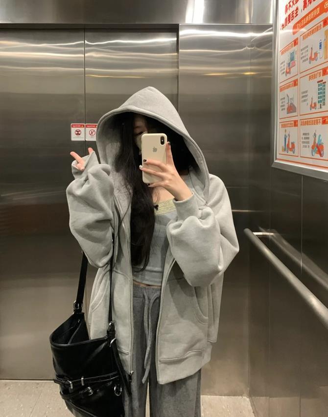 灰色連帽衛衣外套,這個秋天,說什麼也要爲自己入手一件,寬鬆的版型,真的對任何一種身材都友好,而且,像這種顏色款式的外套,裏面可以配多種打底,例如白色t恤、打底衫或者是毛衣等。