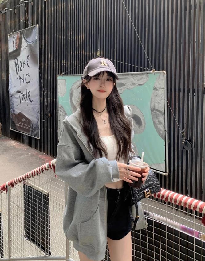 真的好喜歡灰色的外套,特別是這種連帽衛衣外套,真的怎麼都穿不膩,寬寬大大的版型,可藏肉顯瘦了,搭配黑色牛仔短褲,小個子女生這樣穿,輕鬆顯高挑,還可以把下身的比例給拉得很長。