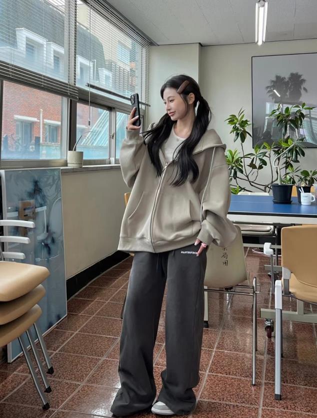 不管是上課,還是日常逛街,這一套休閒的着裝都可以滿足你要求,灰色連帽衛衣外套,搭配同色的休閒褲,真的好喜歡這種休閒簡單的搭配,寬鬆的衣身版型,可藏肉舒適了,喜歡的姐妹們可以安排起來。