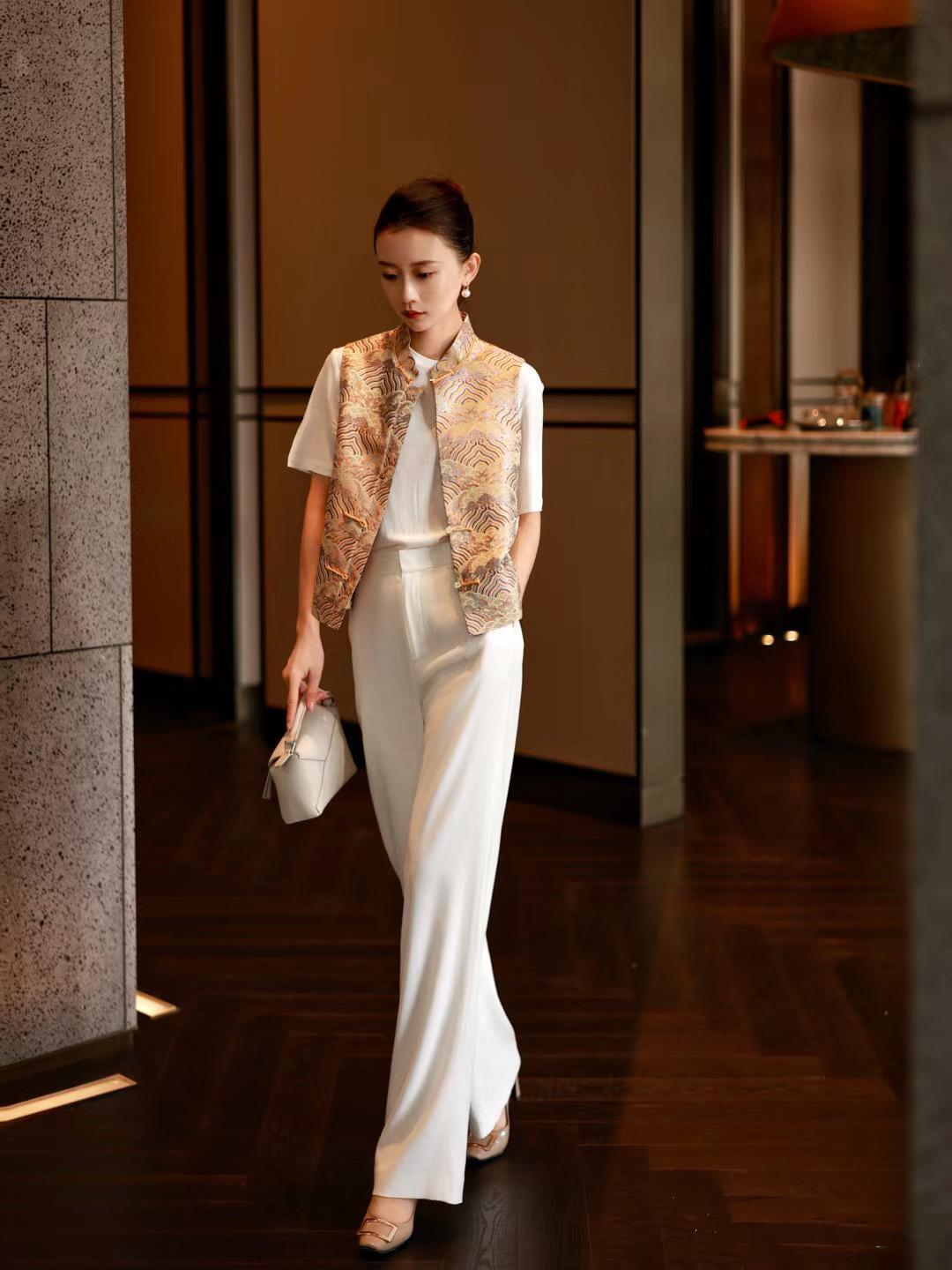如果你對於新中式風格的穿搭不是那麼熟練,則可以選擇從細微處入手。不要一開始就選擇多麼複雜誇張的設計,可以從小量感的新中式馬甲着手。
