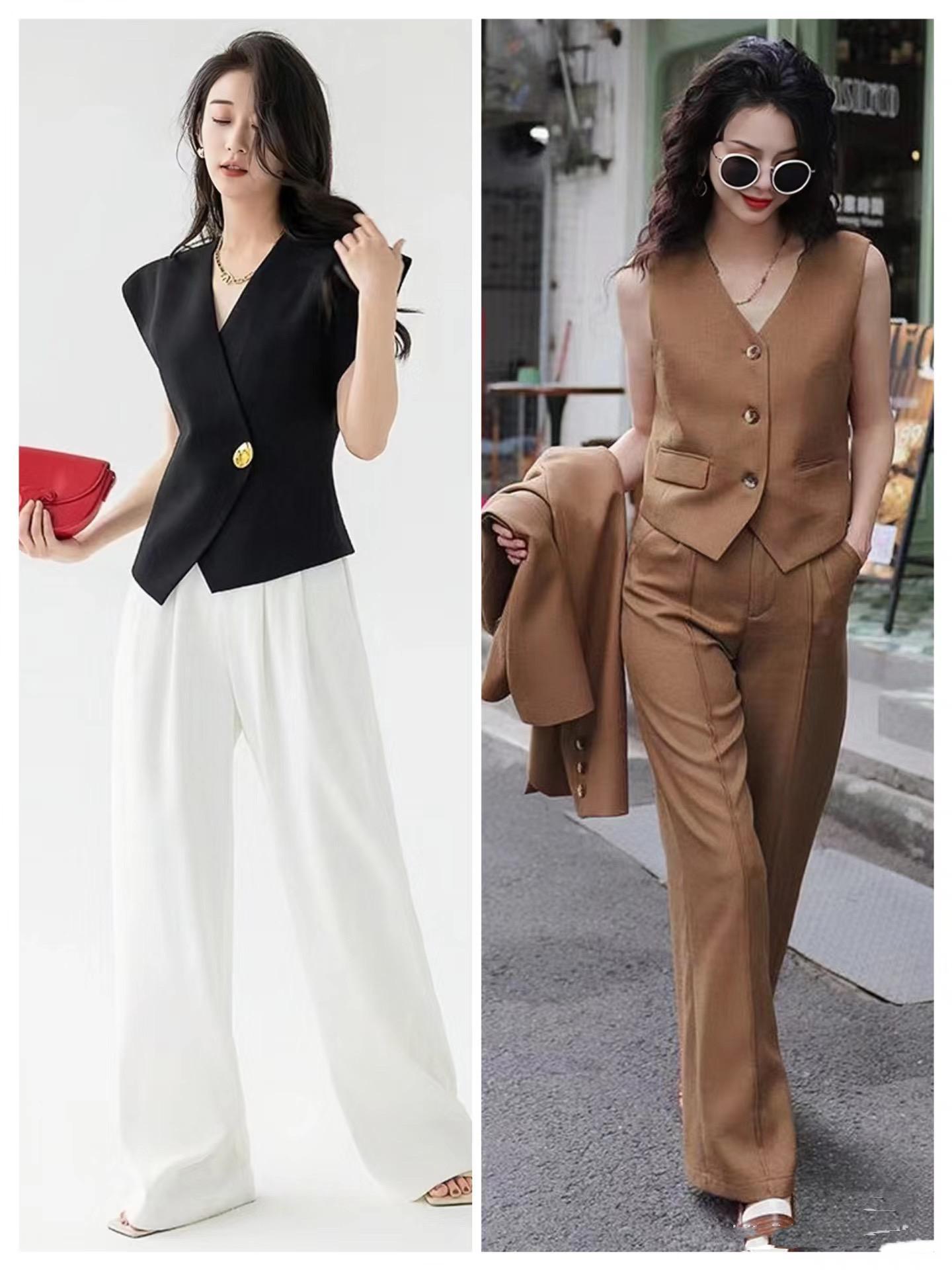 1、新中式馬甲配同色系的闊腿褲,氣場全開、還有腔調