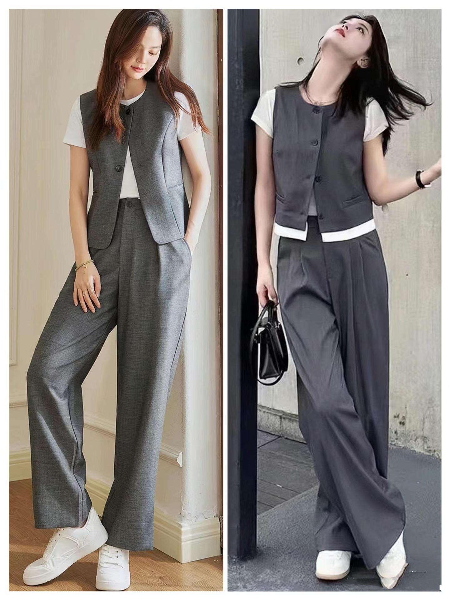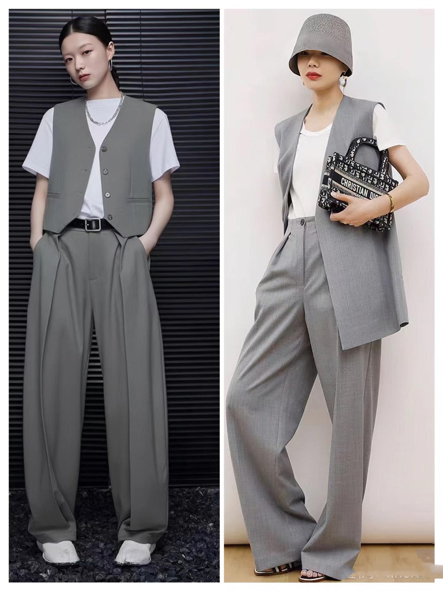 新中式馬甲,配上同色系的闊腿褲,是簡約又別緻的美。這種灰色闊腿褲,可以沿用西裝褲的版型,立體剪裁更具包容性,顯瘦效果也更明顯。