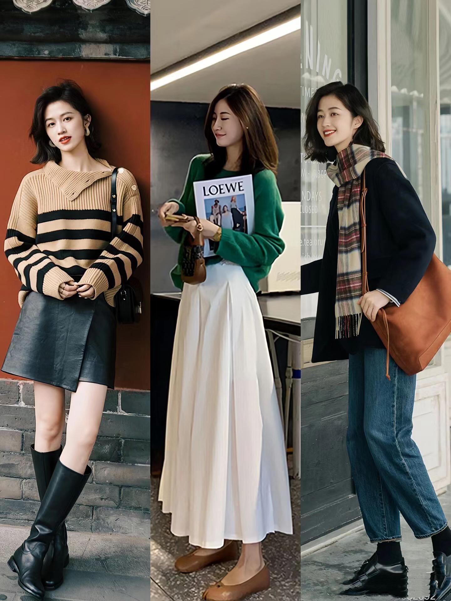 秋天裏一組比較常見的穿搭模板,很顯氣質、也更顯個子高挑,屬於一種精緻且有女人味的穿搭look。