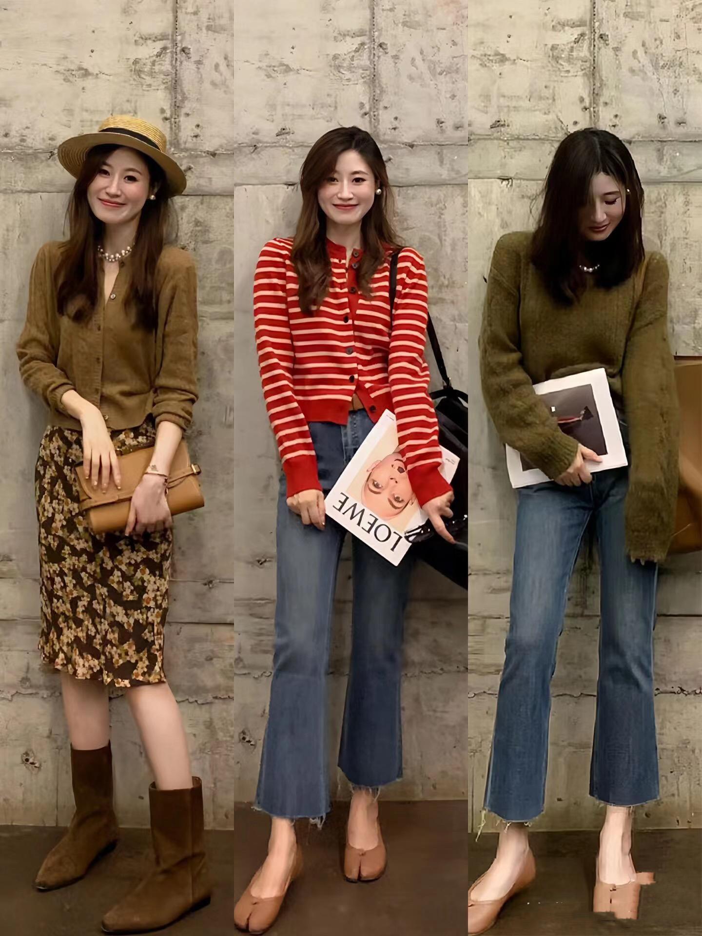 一組格外溫柔的穿搭模板,對於40+的女人來講,借鑑度也是超高的。深色系的針織衫,稍微寬鬆的版型舒適而慵懶。