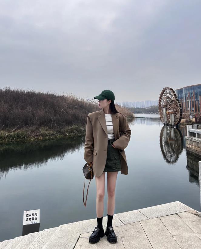 很顯高級的一件西裝外套,寬鬆的版型,對身材一點約束感都沒有,還有就是這個顏色,真的是深得我心,內搭條紋打底,下裝是一條高腰短褲,這種上長下短的搭配,就是很適合小個子女生,加上厚底樂福鞋,腿部線條瞬間就被拉長了。