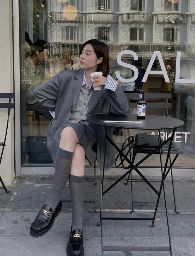 已經進入秋天了,西裝可是最佳首選,灰色廓形西裝外套,搭配百褶半裙,還利用了小腿襪進行點綴,增加了造型時髦度,也豐富了整個造型的層次。