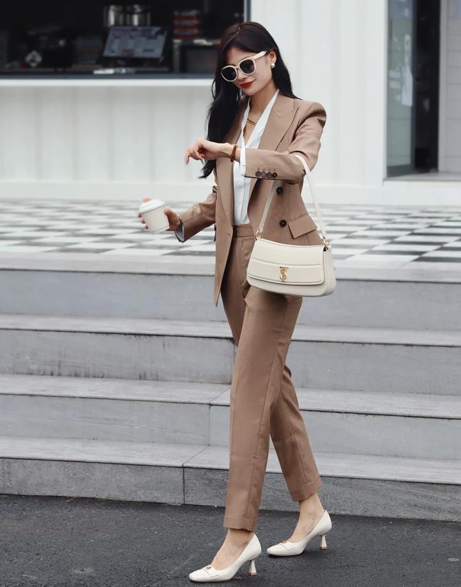 大地色的通勤西裝,這個色調很適合在秋天的時候穿,卡其色賦予了你氣質感和氛圍感,配色同色的西裝褲,對於不想花費時間去搭配的姐妹們,選擇這樣的套裝可是相當不錯的。鞋子配的是一雙白色高跟鞋,精緻大方又顯氣場。
