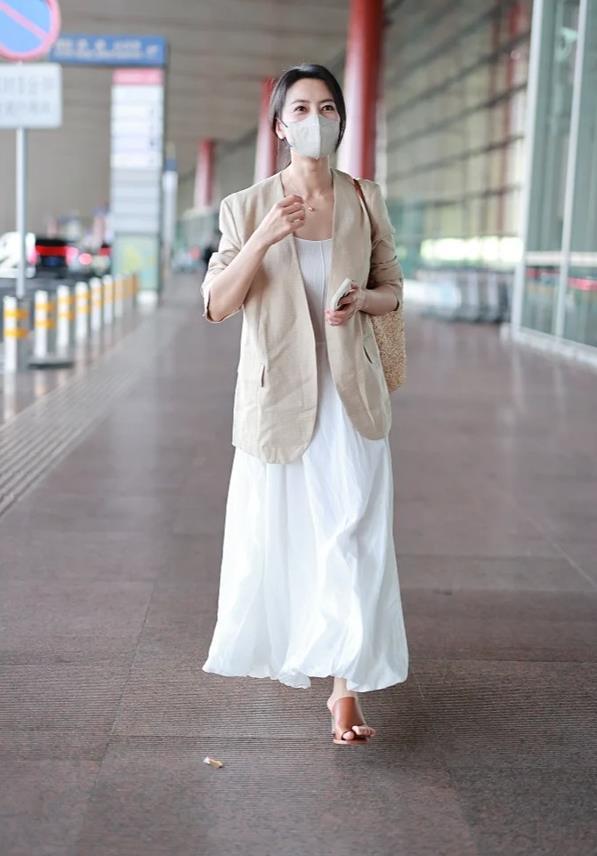 高圓圓的這一套私服穿搭,看起來就非常不錯呢,淺卡其色西裝外套,內搭一件白色連衣裙,腳上的高跟涼鞋也是卡其色的,整個着裝簡潔清爽又高級,這一套的顏色很美,最經典的老錢風穿搭。