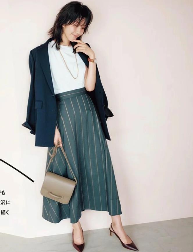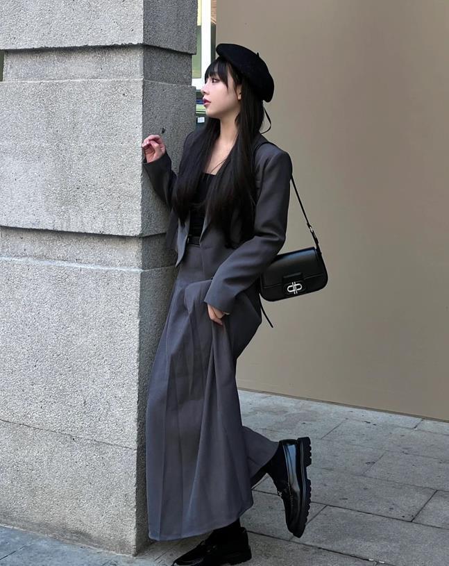 韓劇女主範十足的一套穿搭,灰色小西裝外套+同色百褶半身長裙,上下一致的配色可太高級了,這麼一套穿搭主打的就是一個簡約和高級。內搭黑色樂福鞋,與黑色的包包進行了色彩呼應,增加了造型的和諧度。